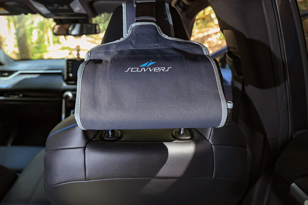 Rolling up the Scuvver seat cover is incredibly easy. Just join the Velcro tabs at each corner, then you can either taco roll it up or fold it into equal sections. Tuck it under the headrest flap and then flip the whole roll up and over the back of the headrest or unclip and stow it away. You can keep the headrest strap on at all times as due to the low-profile design and soft microfibre surface that doesn’t interfere with your head.